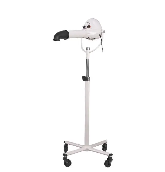 Este secador de segunda mano es un secador de pelo (abajo). Este dispositivo parece un secador de pelo gigante sobre un soporte. Tiene velocidad y flujo de aire variables, puede soplar aire frío o caliente y, cuando está montado, libera las manos del peluquero para cepillarse. El secador de pelo esponjoso se originó en la peluquería canina de exposición y se utilizaba tradicionalmente para preparar perros de exposición de pelo rizado para que su pelaje fuera esponjoso y liso. También es importante que el pelaje quede lo suficientemente liso.