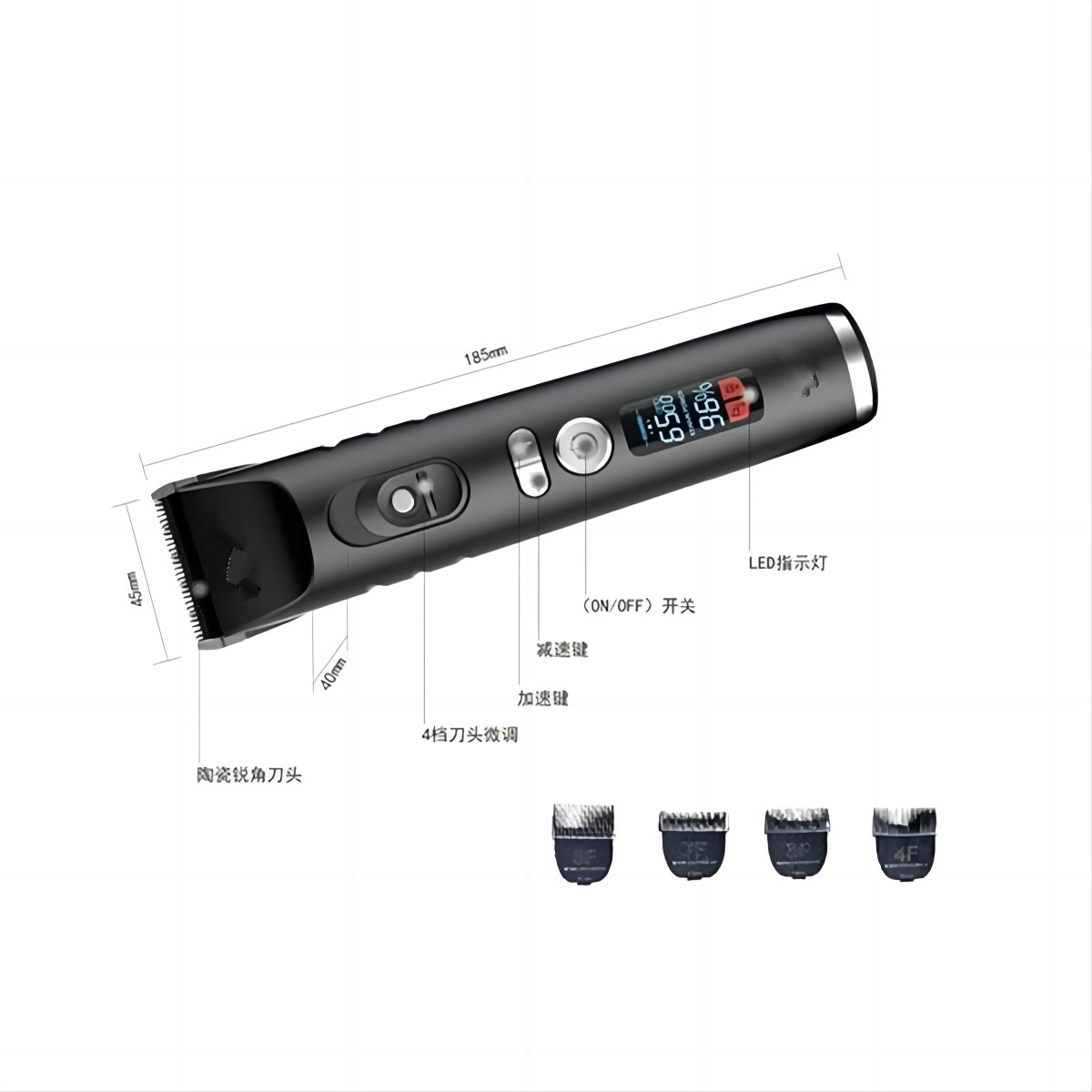 • La pantalla muestra intuitivamente las configuraciones de 5 velocidades, lo que permite un ajuste flexible basado en la densidad del pelo de la mascota, cortando fácilmente incluso el pelo grueso.